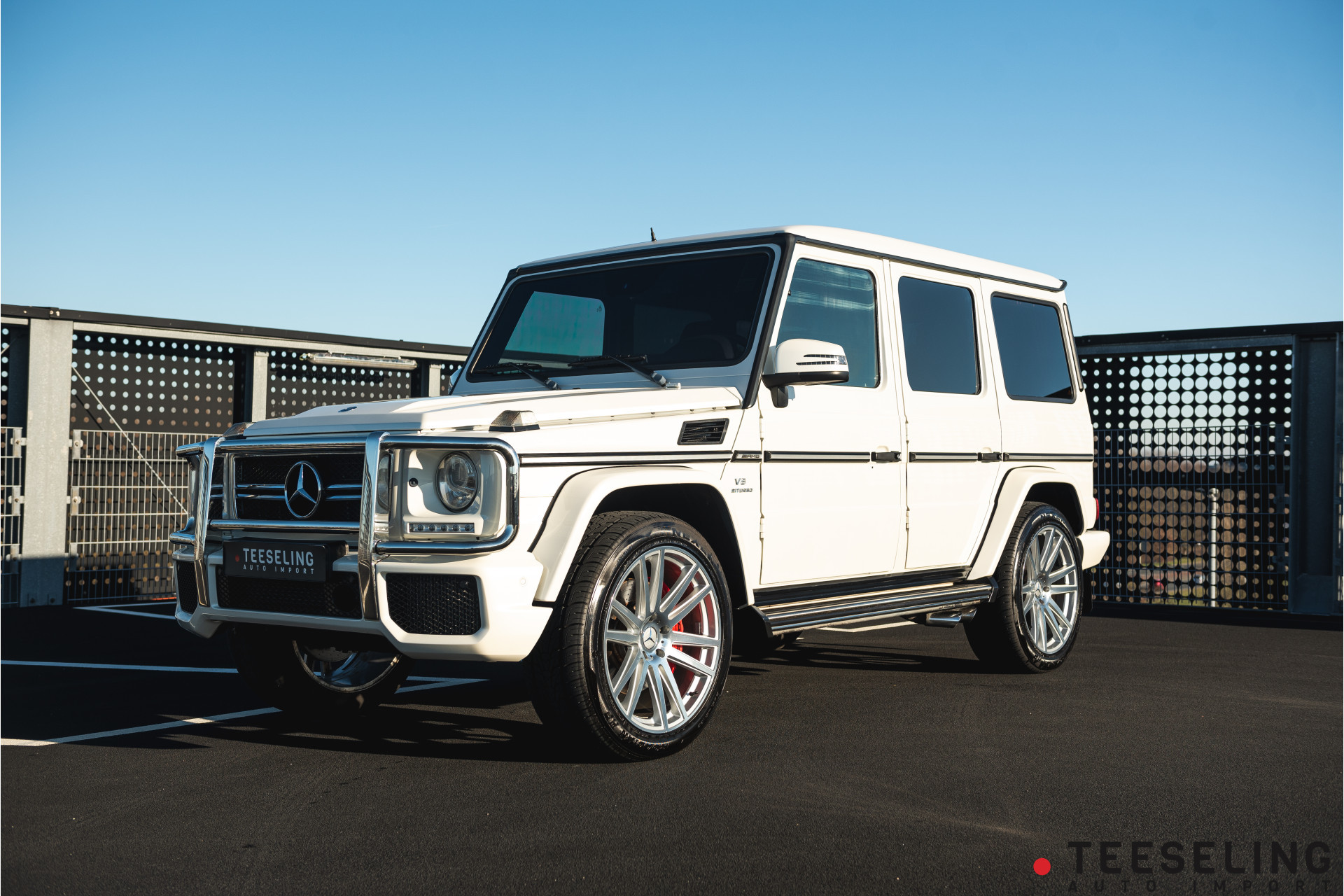 Een prachtige Mercedes-Benz G63 in wit parelmoer uitgevoerd met een zwart/rood lederen interieur. Uniek!